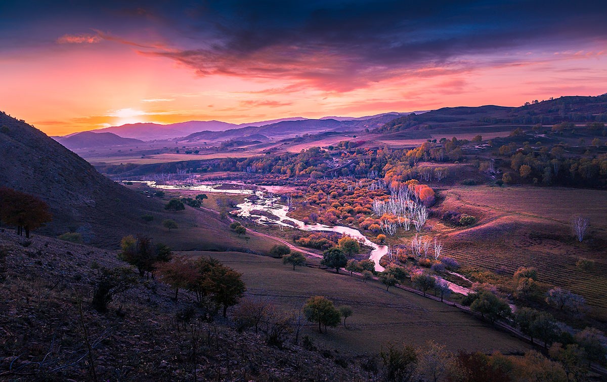 第二日:上午:透风沟日出,光影中起伏的山峦,草原,河流,南井出牧,红色的蔡木林,线条,金色的麦田。下午:刘家地,杜家地,猫耳山沿线风光,光影下的牛羊群,直至日落。